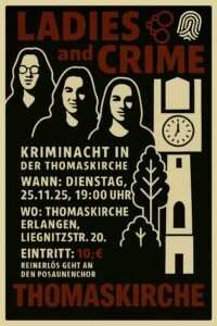 Drei mutige Krimiautorinnen (Katharina Drüppel, Birgit Gruber, Christina Wermescher) wagen sich in die Thomaskirche, Erlangen, und präsentieren eine spannende und unterhaltsame Mischung ihrer aktuellen Kriminalromane.