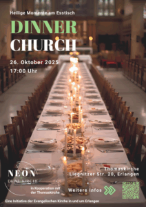 Eine lange festlich gedeckte Tafel mitten in der Kirche. Der Duft von frisch gekochtem Essen erfüllt den Raum. Fremde Menschen kommen zusammen und teilen für einen Abend Brot und Leben. Das ist die Dinner Church. Wir helfen alle zusammen beim Kochen, Tisch decken und dekorieren. Unser gemeinsames Essen wird umrahmt von einer Liturgie mit Abendmahl. Zwischen Kerzenlicht und Brot brechen entsteht Raum für ehrliche Gespräche über Gott und die Welt.